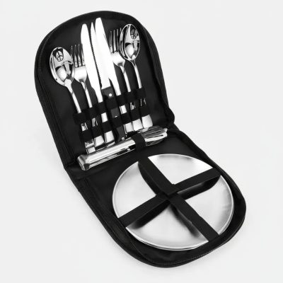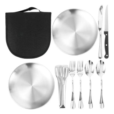 Set De Cubiertos Y Platos Metálicos Para Camping O Asado