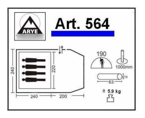 Sobretecho y avance poliéster taffeta 190T aluminizado, mosquitero, estructura de fibra de vidrio, piso de lona cubretodo impermeable (en dormitorio), y 2 ventanas laterales.