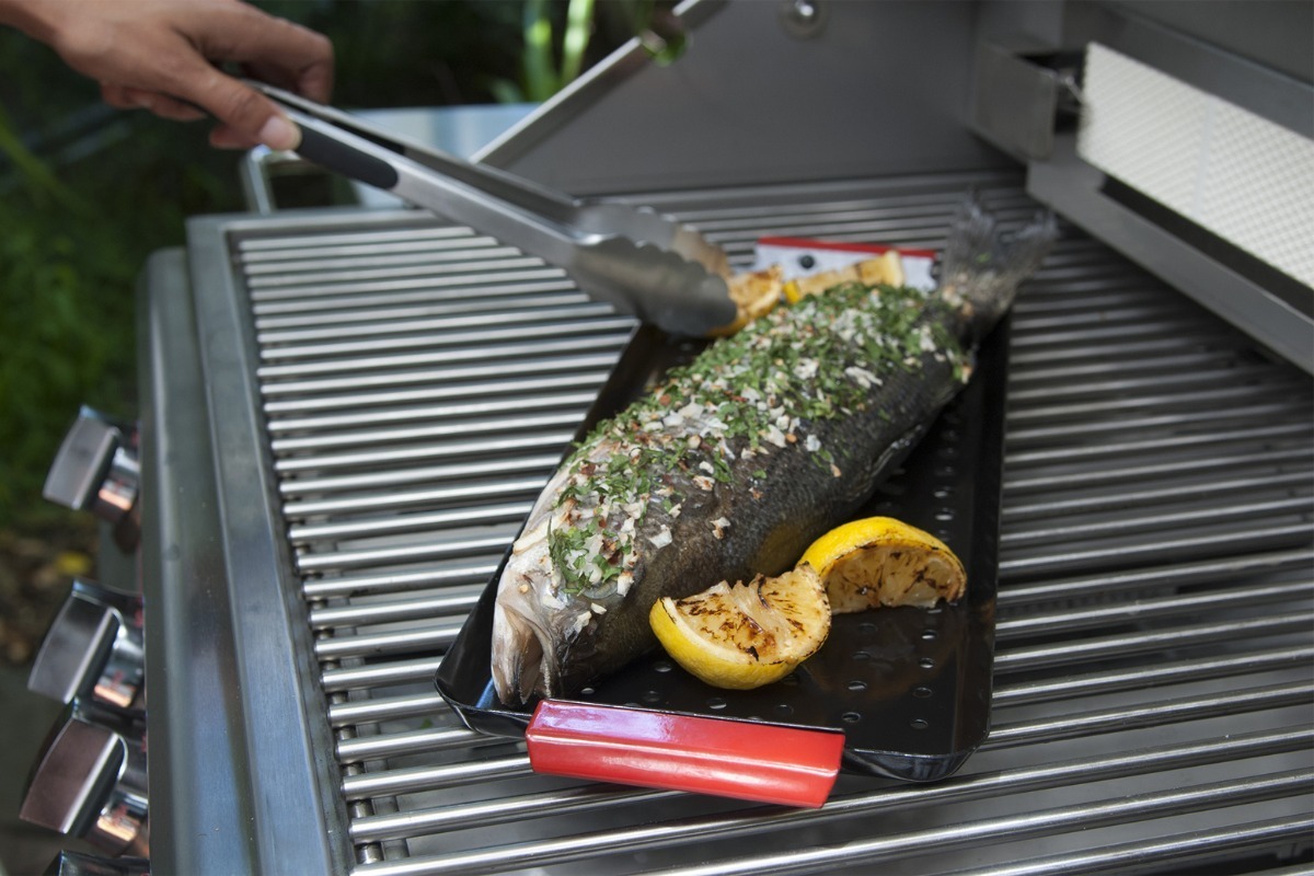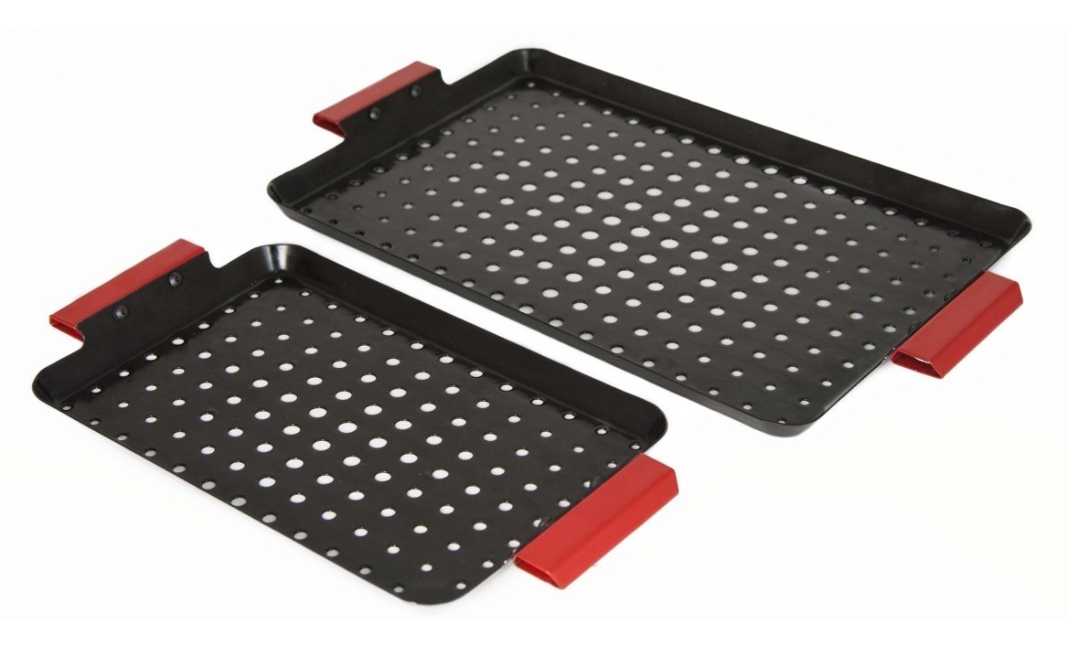 Nuestra parrilla de pescado conduce a altas temperaturas con las que cocinar pescado, vieiras, camarones y otros mariscos, pero es liviana y fácil de limpiar. Las perforaciones de la rejilla permiten que los jugos se drenen y también crean zonas de temperatura, con el medio de la rejilla cada vez más caliente. Los alimentos deben colocarse en el medio para el corte y más cerca de los bordes si se prefiere menos calor. Hecho de acero duradero. Aptas para el lavavajillas.