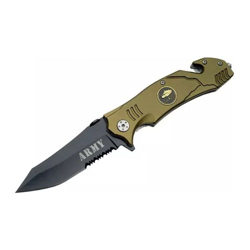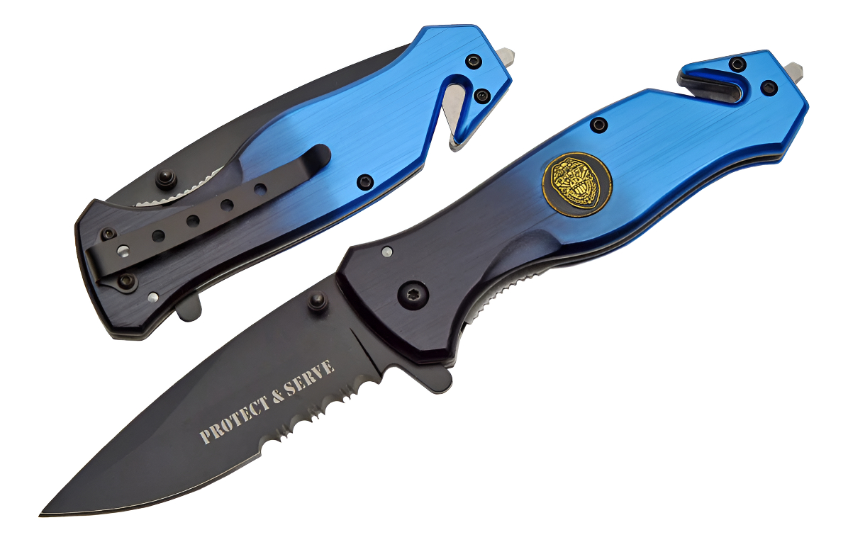 El Magnum Knife ilustrado es el Boker Magnum Fire Fighter Rescue Knife que cuenta con una hoja tanto inversa dentada de 3 3/8 «hecha de acero inoxidable 440. La hoja de este Magnum Knife tiene una capa negra no reflectante, un pulgar y una aleta para apertura ambidiestra con una mano. El mango de aluminio anodizado rojo, 4 3/4 «cerrado, tiene revestimientos dobles de acero para mayor resistencia, el escudo de bombero, un candado de revestimiento, un rompevidrios y un cortador de cinturón de seguridad.
