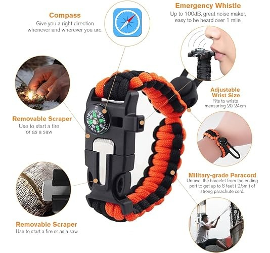 Pulsera Paracord de supervivencia, silbato de emergencia , brújula para senderismo, kit de iniciación de fuego para acampar, pulsera táctica para acampar al aire libre