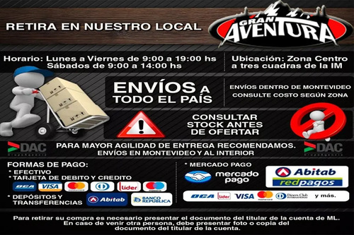 ENVÍOS: Hacemos envíos a todo el país por la agencia DAC , si utilizas la opción mercado envíos va únicamente por agencia UES